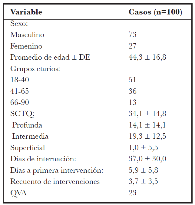 El porcentaje de SCTQ se calculó en todos los casos con la tabla de Lund y Browder al ingreso. Se recabaron los datos del sistema informático del centro donde se registra la ficha patronímica, SCTQ, presencia o ausencia de QVA (quemadura de vía área), profundidad de quemaduras, ingresos a block quirúrgico, y días de internación. Los datos se pasaron a una planilla electrónica.