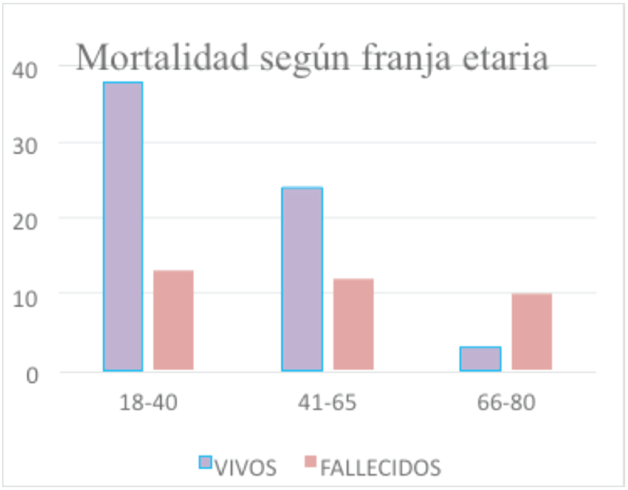 La edad promedio fue de 44,3 ± 16,8 años. Se realizó una subdivisión de la edad en tres grupos etarios debido a referencias ya reportadas en cuanto a mortalidad y edad. El primero incluyó los pacientes de 18 a 40 años (n=51), el segundo de 41 a 65 (n=36) y el tercero con mayores de 65 años (n=13). Se evidenció con un aumento considerable en la mortalidad con el aumento de la edad (p<0,001). (Gráfica 1)