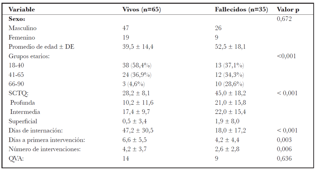 El lapso desde el ingreso hasta la primera intervención en block quirúrgico fue en promedio de 5,9 ± 5,8 días y cantidad de ingresos de cada paciente a block quirúrgico fue en promedio, 3,7 ± 3,5, ambas variables sin diferencias estadísticamente significativas en cuanto a mortalidad. 23 de los 100 pacientes fueron inicialmente categorizados con QVA.