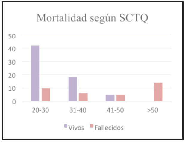 Se calculó mediante regresión logística el AL50, definido como el porcentaje SCTQ a partir del cual, en una cohorte determinada, la probabilidad de morir es del 50%. En todos los análisis se adoptó como nivel de significancia estadística un valor p <0,05 bilateral. Los datos se analizaron en Excel, JASP y RStudio.