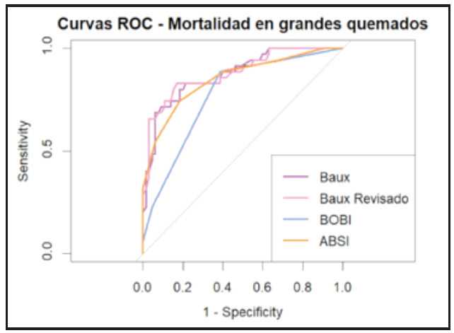 Para evaluar la discriminación entre distintos scores clínicos predictores de mortalidad se realizó análisis de curvas ROC (Receiver Operating Characteristic curve) con su respectiva AUC (Area Under Curve) en RStudio. Se analizaron los scores de Baux, Baux revisado (Baux R), el Belgium Outcome Burn Injury (BOBI) y Abbreviated Burn Severity Index (ABSI), comparados en su calidad de predictores de mortalidad con el test de DeLong. Por último, se aplicó el test de Hosmer-Lemeshow para la calibración de las pruebas teniendo en cuenta la mortalidad esperada con la prueba y la real de la muestra.