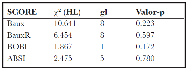 Para valorar la calibración de los modelos respecto a los datos del centro se aplicó el test de Hosemer-Lemeshow en el cual se compara la mortalidad observada con la esperada. Se obtuvieron resultados con un valor p mayor a 0,05 en todos los modelos. Esto indica una calibración apropiada para de los scores como se ve en la tabla (Tabla 4).