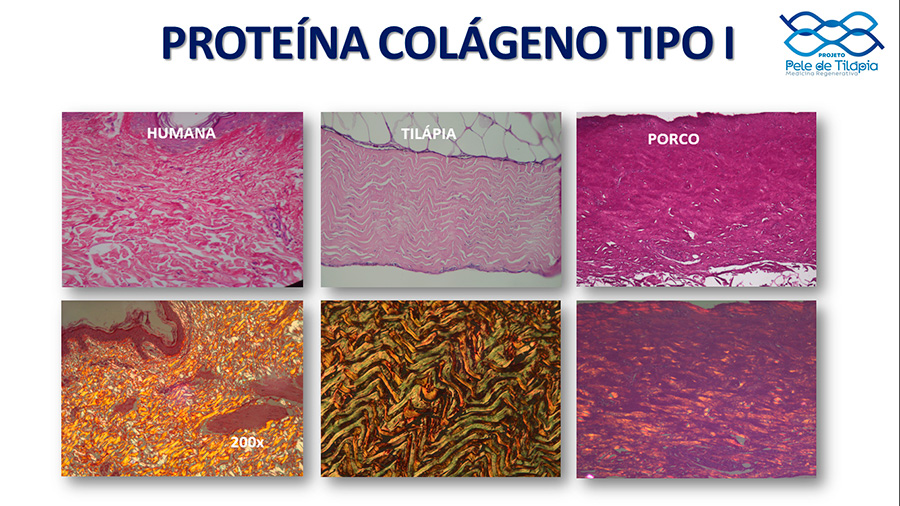 Os estudos pré-clínicos foram realizados no Núcleo de Pesquisa e Desenvolvimento de Medicamentos da Universidade Federal do Ceará (NPDM-UFC). As análises histológicas demonstraram que a derme da pele de tilápia apresenta elevada concentração de colágeno tipo I, um componente essencial no processo de cicatrização, em níveis superiores aos encontrados na pele humana e até duas vezes maiores que na pele suína (Figura 1) (1).