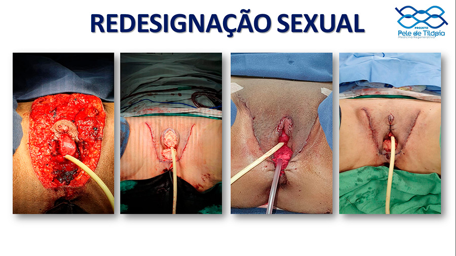 Na ginecologia e nas cirurgias de redesignação sexual, o uso da pele de tilápia liofilizada para a confecção de neovaginas apresentou resultados promissores. Pacientes com Síndrome de Mayer-Rokitansky-Küster-Hauser (MRKH) (Figura 9) e mulheres transgênero (Figura 10) submetidas a vaginoplastia relataram melhorias significativas em aspectos como lubrificação, elasticidade e aceitação do tecido neovaginal. A alta biocompatibilidade do curativo reduz a incidência de rejeição e infecções, proporcionando um ambiente propício para a regeneração e funcionalidade do novo tecido. Estudos preliminares indicam que esse biomaterial pode representar uma solução acessível e eficaz para procedimentos reconstrutivos, com potencial para melhorar a qualidade de vida e o bem-estar psicológico dos pacientes. Porém, a dilatação mecânica periódica do canal vaginal recém-formado é essencial para a manutenção da estrutura até sua estabilização. Estes estudos apontam que o uso da pele de tilápia representa uma solução eficaz e acessível para reconstruções vaginais, com potencial impacto positivo na qualidade de vida e no bem-estar psicológico dos pacientes (10–12).