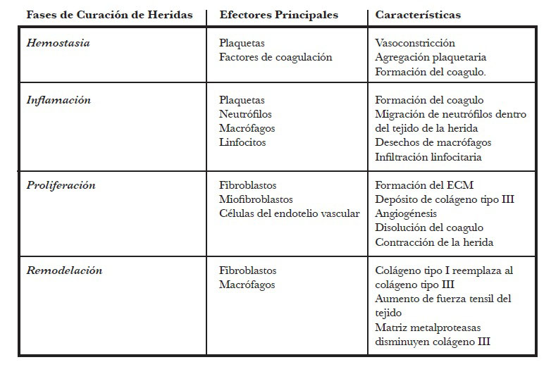 Después de la proliferación y la síntesis de ECM, la cicatrización de heridas pasa a la fase final de remodelación más larga, que es un equilibrio entre la producción, descomposición y remodelación de ECM, que continúa durante semanas o meses e incluso, en algunos casos, durante años (30). Esta fase se caracteriza por una proliferación celular reducida, apoptosis de la mayoría de las células endoteliales, macrófagos y miofibroblastos, reemplazo de glicosaminoglicanos por proteoglicanos y sustitución de colágeno III por colágeno I a través de la acción de colagenasas y metaloproteasas de matriz (MMP) (30,31). El resultado crítico de la reorganización de la ECM es remodelar para formar una arquitectura que se asemeje más a los tejidos normales. La manifestación clínica de esta fase es una cicatriz blanda palpable, que varía de color rosado a pálido debido a la microvasculatura de la cicatriz (32). A medida que la vascularización retrocede, el tono de la cicatriz cambia en consecuencia.