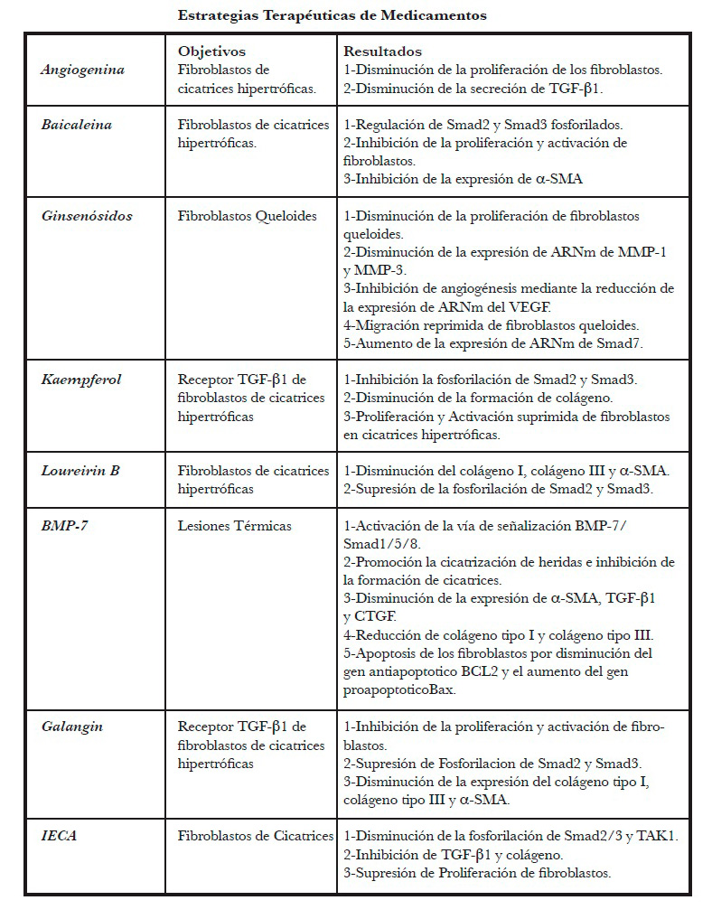 Dado que la vía dependiente de Smad inducida por TGF-β es fundamental para la pathogenesis de todas las enfermedades fibróticas, se han investigado varias estrategias terapéuticas para apuntar a la vía de señalización para atenuar la formación aberrante de cicatrices cutáneas. Estas estrategias se pueden subdividir en estrategias terapéuticas de medicamentos, posibles estrategias terapéuticas genéticas y celulares. Los efectos de ambas estrategias terapéuticas se muestran en la Fig.1, Fig.3.