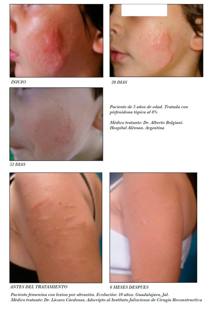 Las cicatrices hipertróficas pueden ocurrir hasta en el 91% de todas las lesiones por quemaduras y entre el 40-70% de las cirugías (5). Hay estudios que demuestran la eficacia de la pirfenidona en tratamientos de forma tópica, como el realizado en ratones con quemaduras profundas de espesor parcial (6). Y en pacientes humanos para mejorar la epitelización de sitios donantes de injertos de piel de espesor parcial (STSG) (7, 8). La administración tópica de Pf puede considerarse como un uso terapéutico cuando se requieren tiempos de curación más rápidos, como en las zonas de donantes en pacientes quemados.